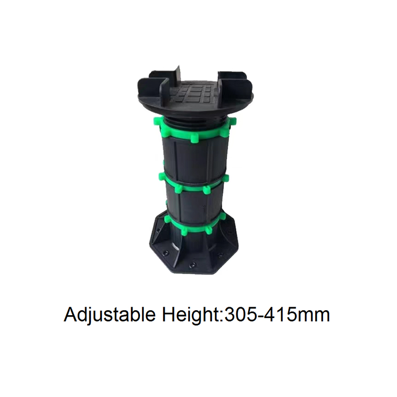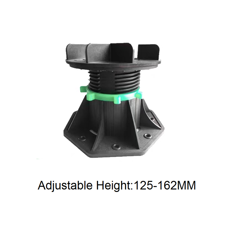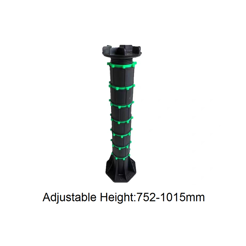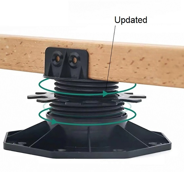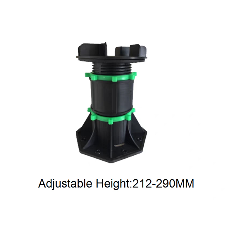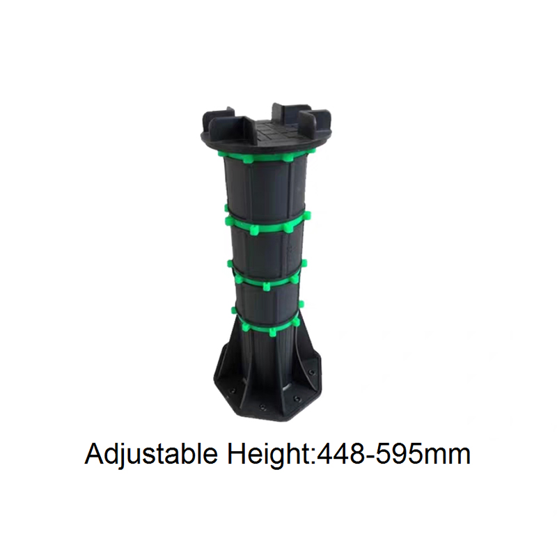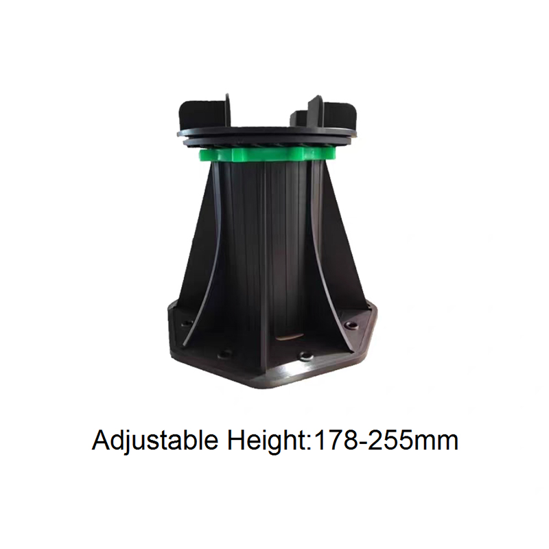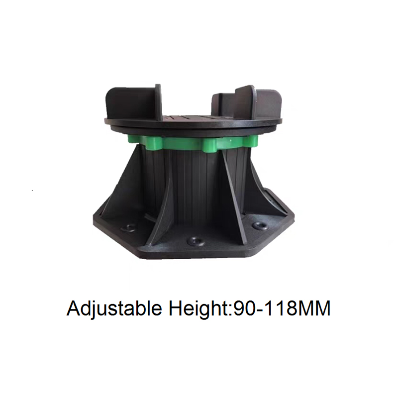 The Adjustable Pedestal for WPC Decking and Tile is a height-adjustable support designed for both outdoor and indoor decorative flooring. Made of a black engineering plastic body with green adjustment components, the pedestal consists of a circular load-bearing platform, an adjustable center section, and a hexagonal stabilizing base. The height can be freely adjusted from 90mm to 118mm, allowing for quick adaptation to varying thicknesses of wood-plastic composite (WPC) flooring and tiles, ensuring smooth, stable support.