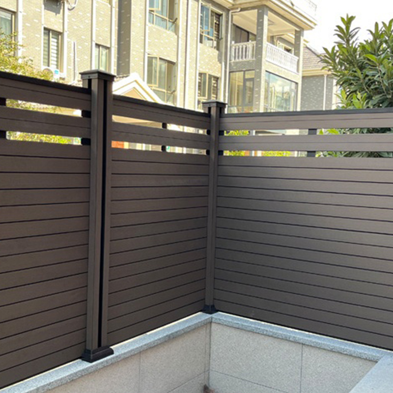 WPC wood-plastic composite fencing combines the beauty of natural wood grain with the durability of plastic. Its modular design allows for quick assembly of posts and horizontal panels using slots or screws, making it suitable for both DIY and professional installation. The fencing shown in the photo is dark gray (charcoal gray) with clean lines and a fence-like structure. The evenly spaced horizontal panels ensure ventilation and light transmission while providing a good privacy barrier. The overall design is modern and stable, easily integrating into a variety of outdoor environments, including courtyards, gardens, and commercial terraces.